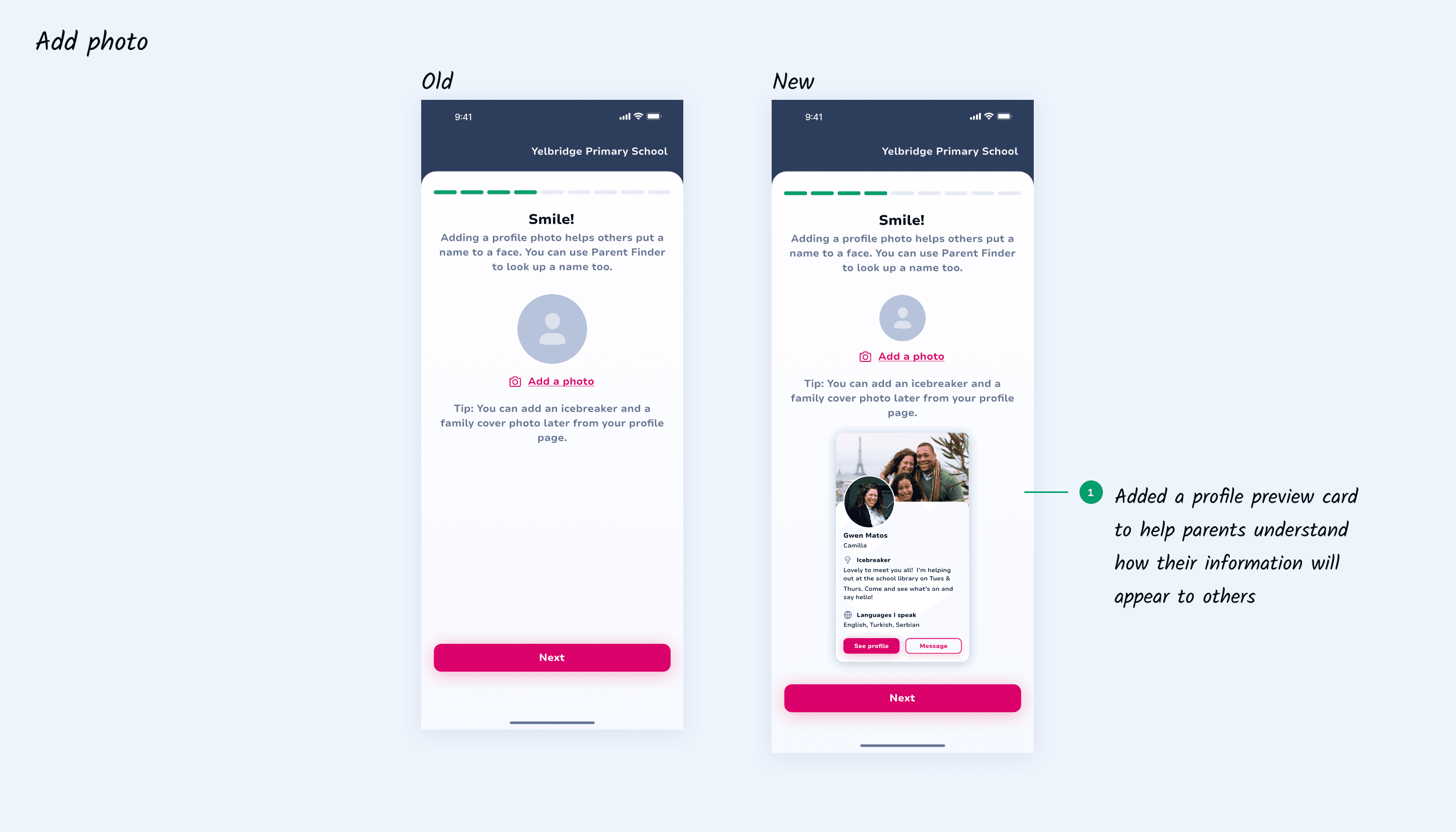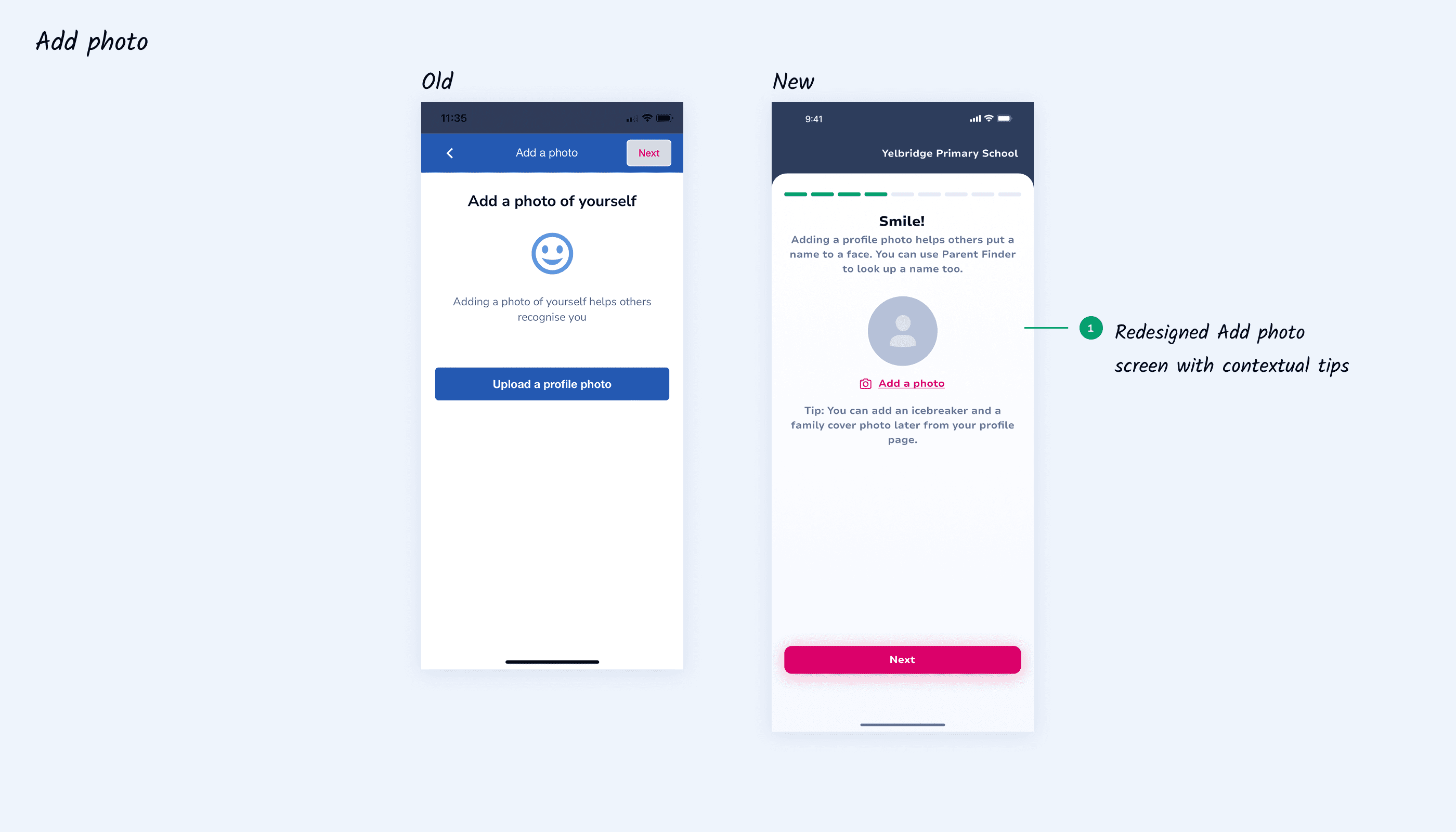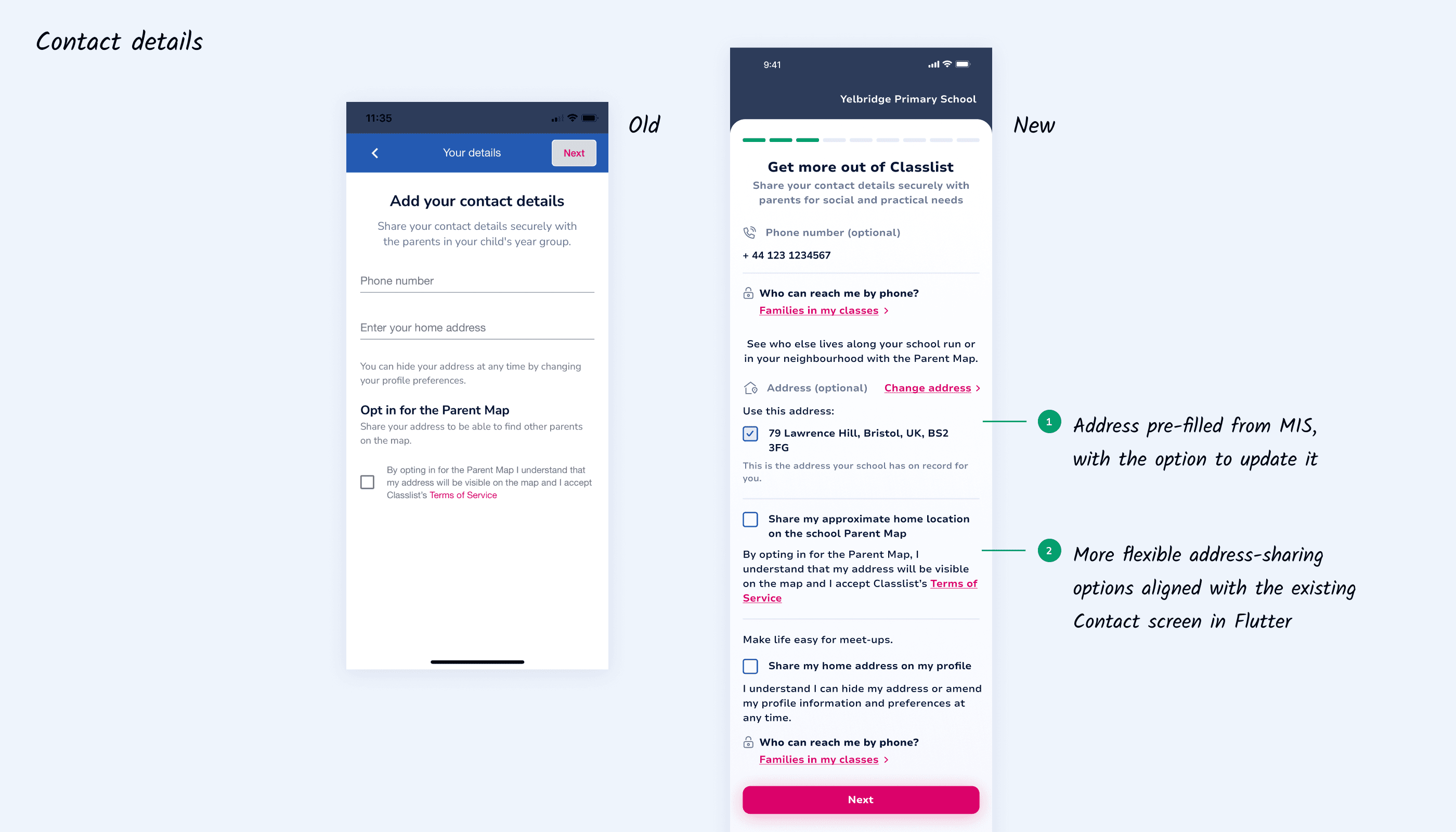 Next, we focused on improving account activation, contact details, and profile photos. The activation screen was updated with MIS-auto-filled data and a clearer stepper to guide parents. We refined the password logic to strengthen security and provide better feedback. The contact details screen was redesigned to align with the existing Flutter system, giving parents more control over address updates and sharing preferences. Finally, we refreshed the “Add photo” screen using the new Classlist design system to encourage parents to personalise their profile.