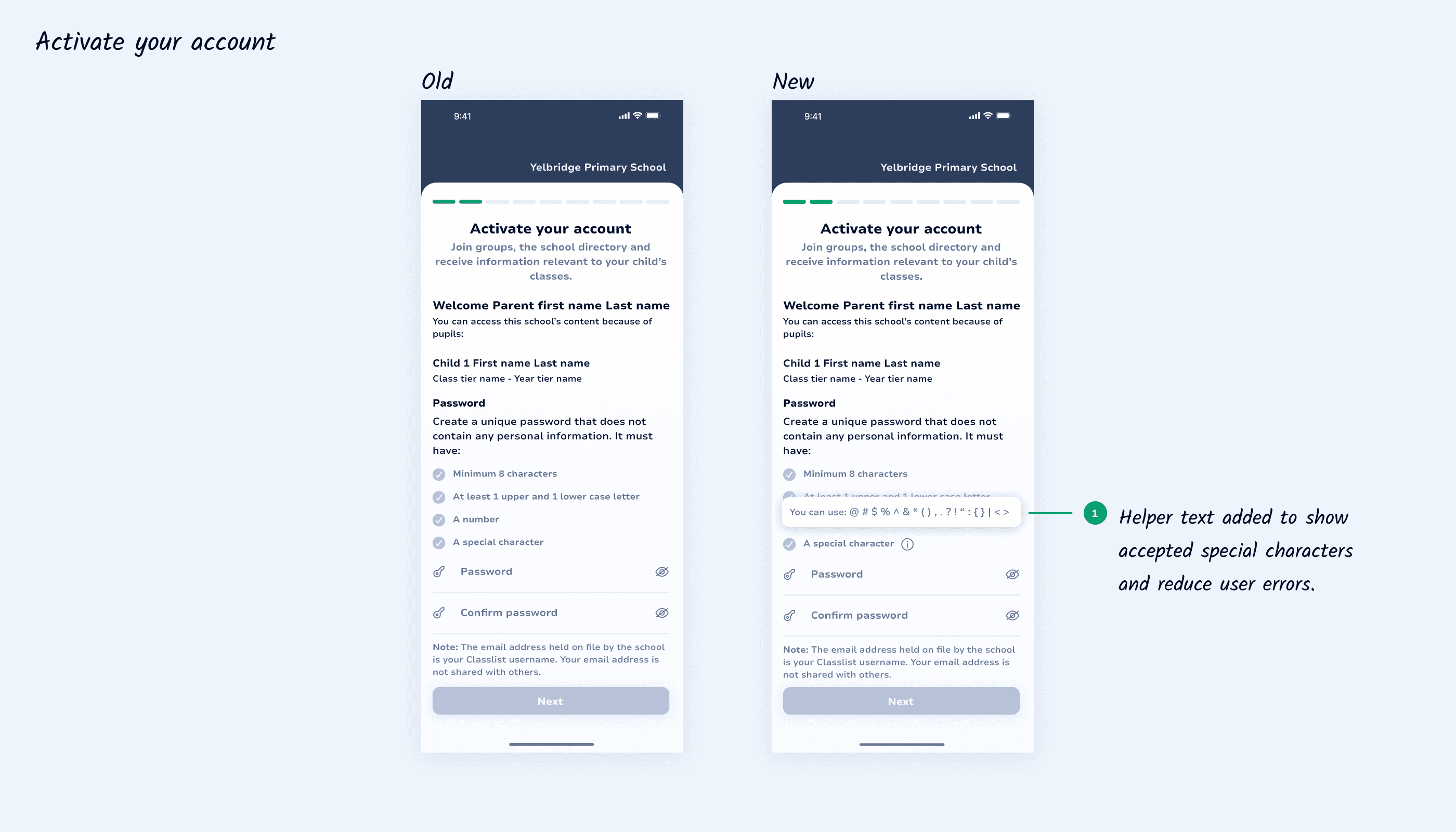 The initial password validation wasn’t specific enough. “Include a special character” left parents guessing, so we added helper text listing the accepted characters. This made the requirement clear and significantly reduced errors.