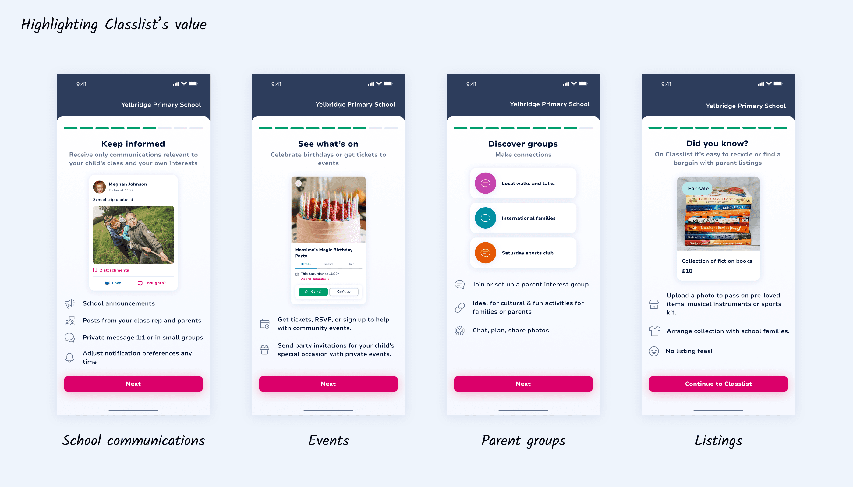 With the new logic in place, registering an account became quick and seamless, but we didn’t want to stop there. We aimed to elevate the onboarding experience and communicate Classlist’s value early. Working closely with the product owner, I designed screens that highlighted Classlist’s key features and functionality, along with a few extra refinements to the activation flow.