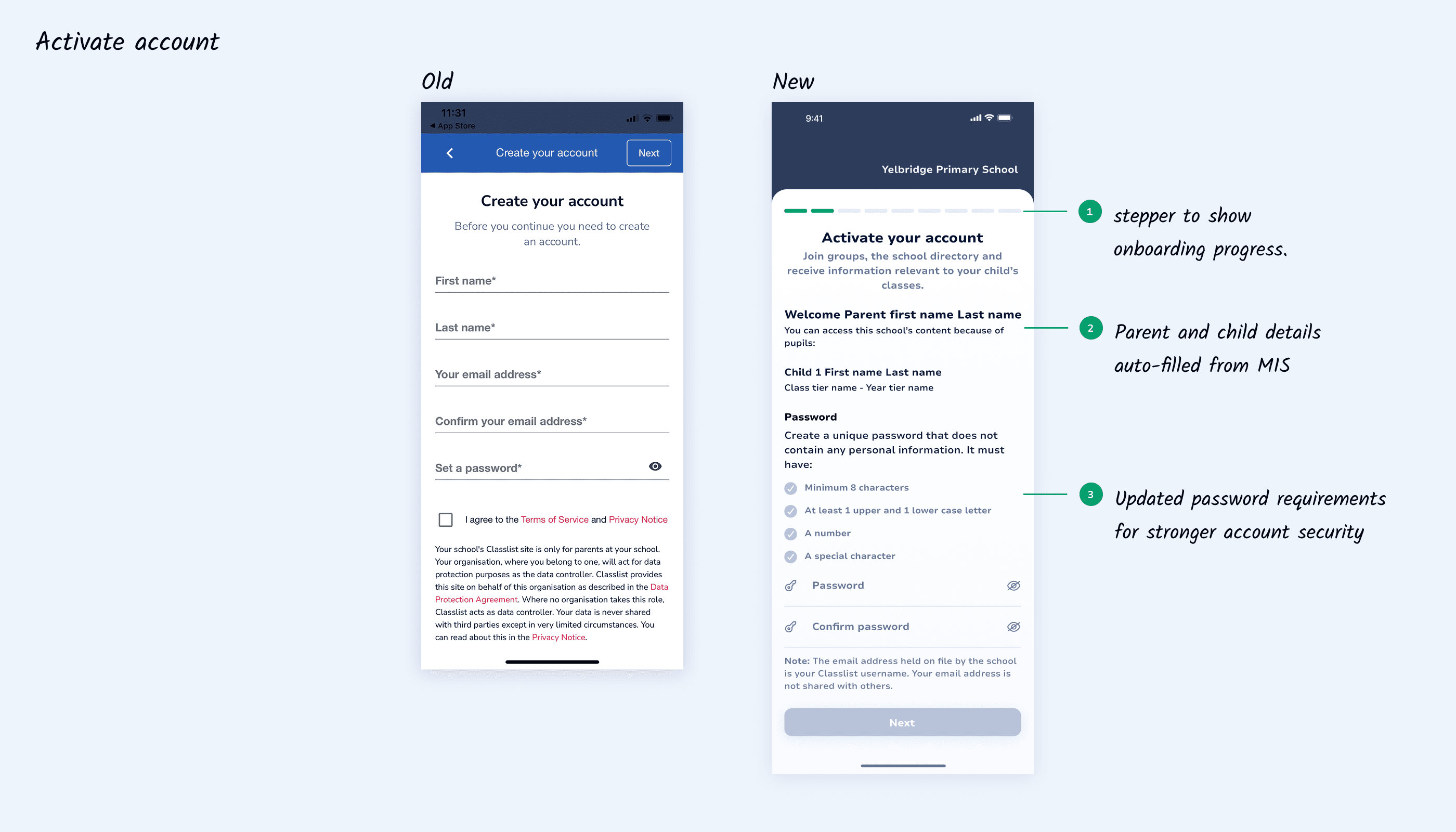 These decisions shaped a secure onboarding journey that respected school-managed data while still giving parents control over their information. The old registration flow was built on the previous web-app design system and no longer aligned with the native mobile experience or the updated MIS-driven logic. I redesigned both the structure and visual language of the flow to bring it in line with the current mobile design system.
